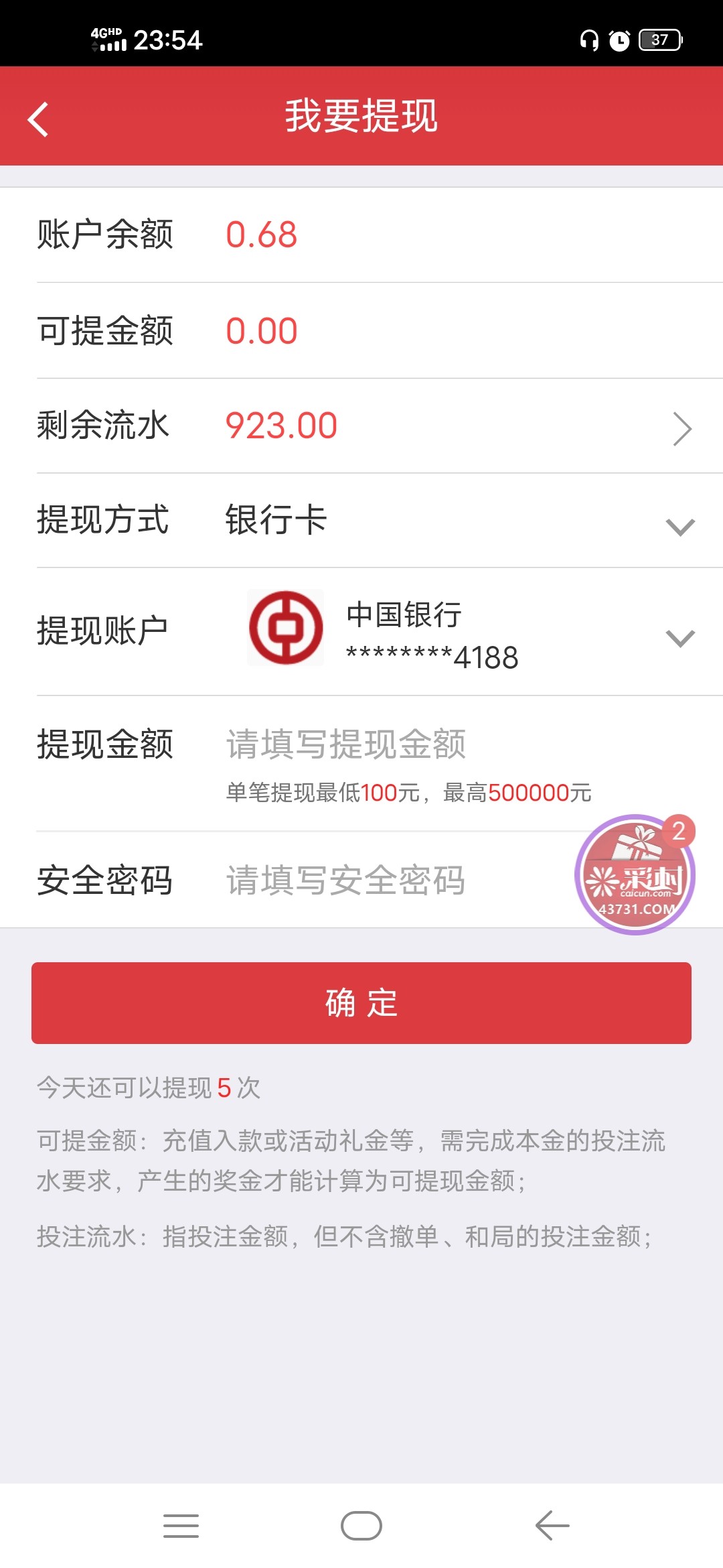 冲了500进去,打完流水去提现,不给提,说违规,又罚10倍流水输完,流水都没打完,大家千万别玩。