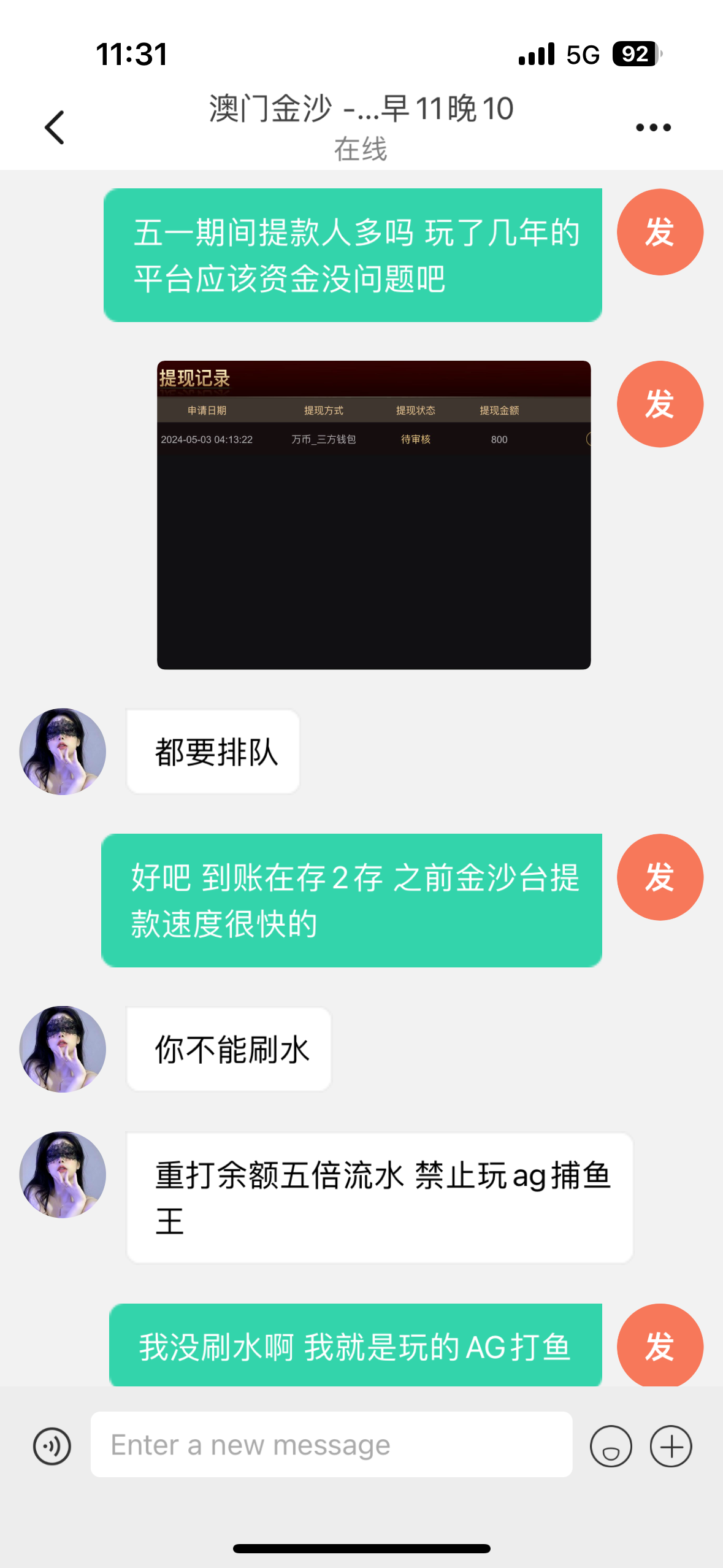 存款500提款800黑钱了 之前一次赢一点 提款3分钟到账可能是没输钱 存了赢了就说刷水 罚我流水罚流水期间按照流水比例设定了负利打完流水就输光了