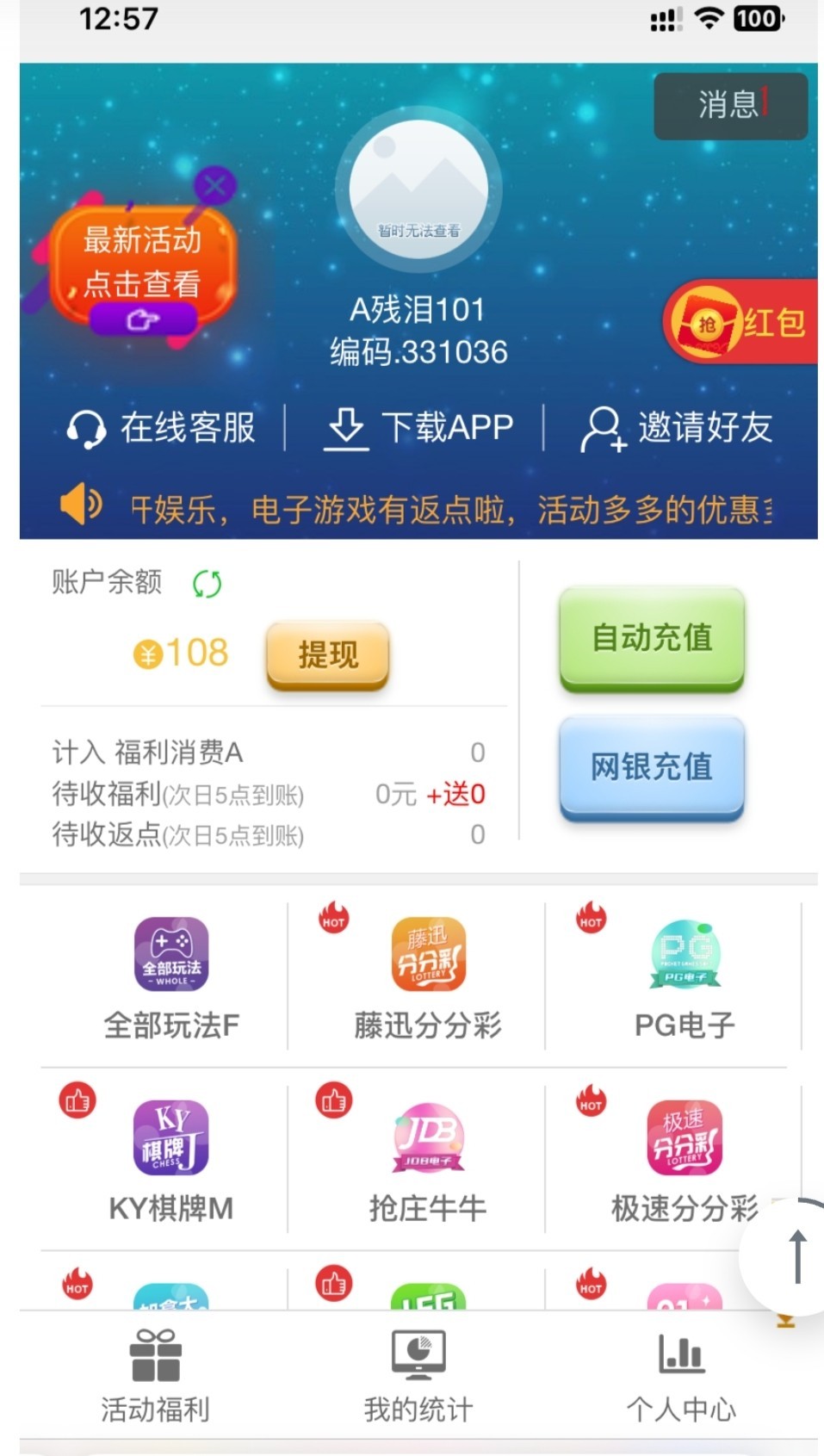 老用户充值娱乐过或者拉过人自行上号查看,是否有108彩金,出款自测!