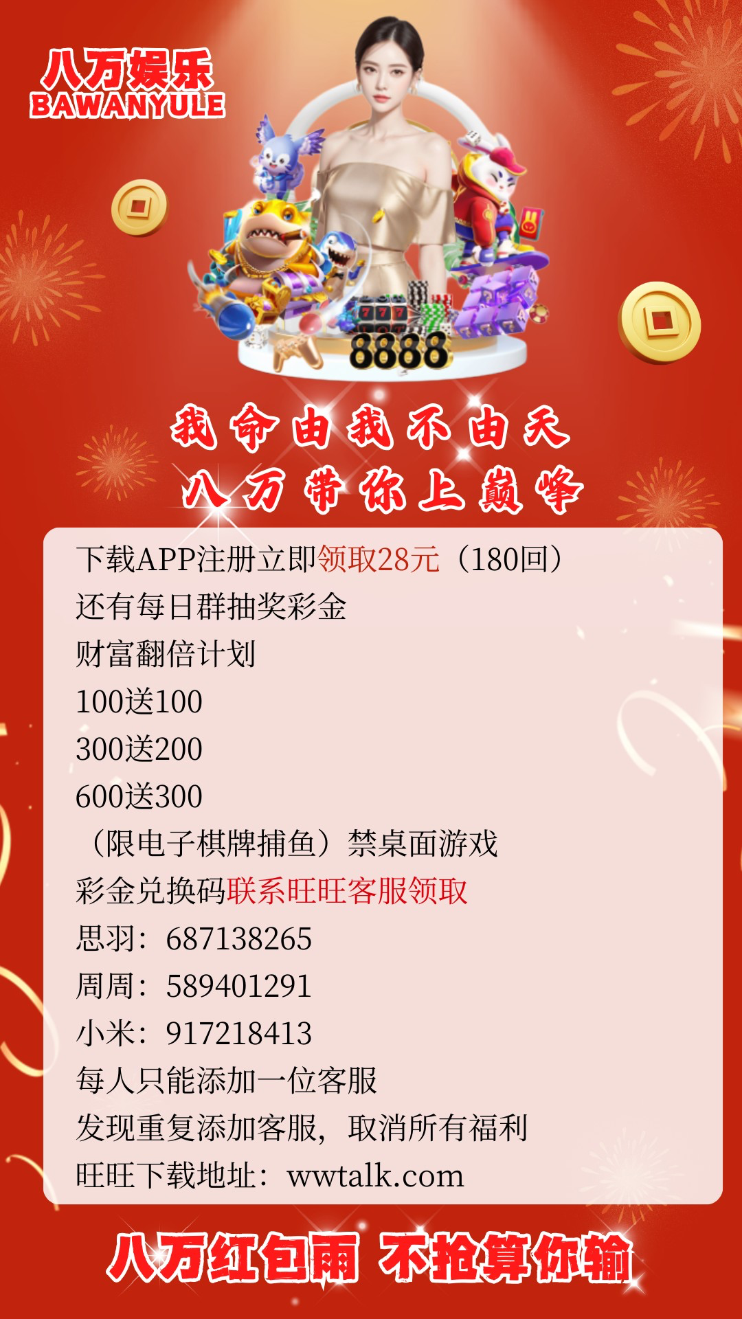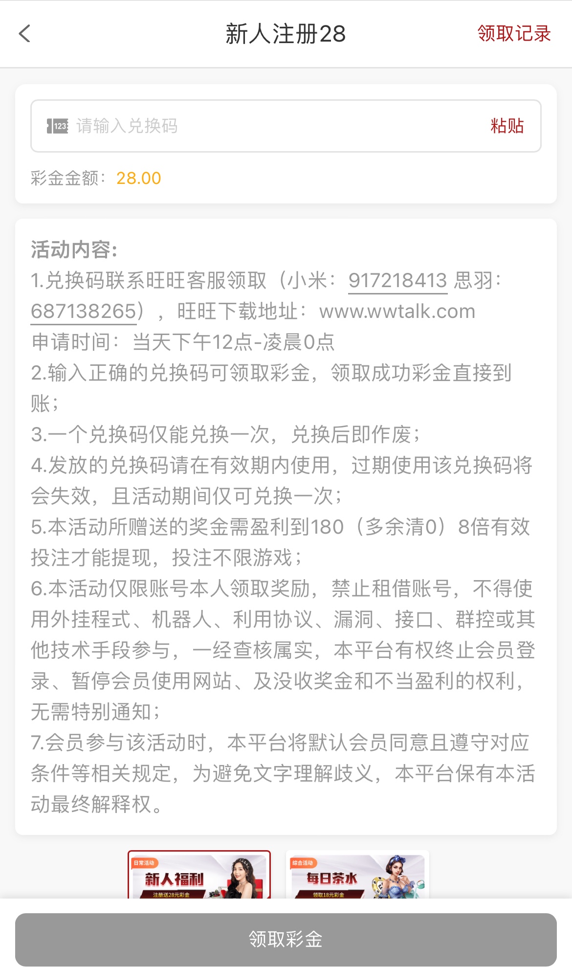 联系旺旺客服领28新人注册彩金代码,8倍流水,只能提180