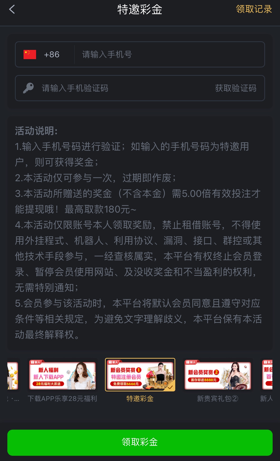 注册完善信息优惠里自助领取,5倍流水,最高提现180