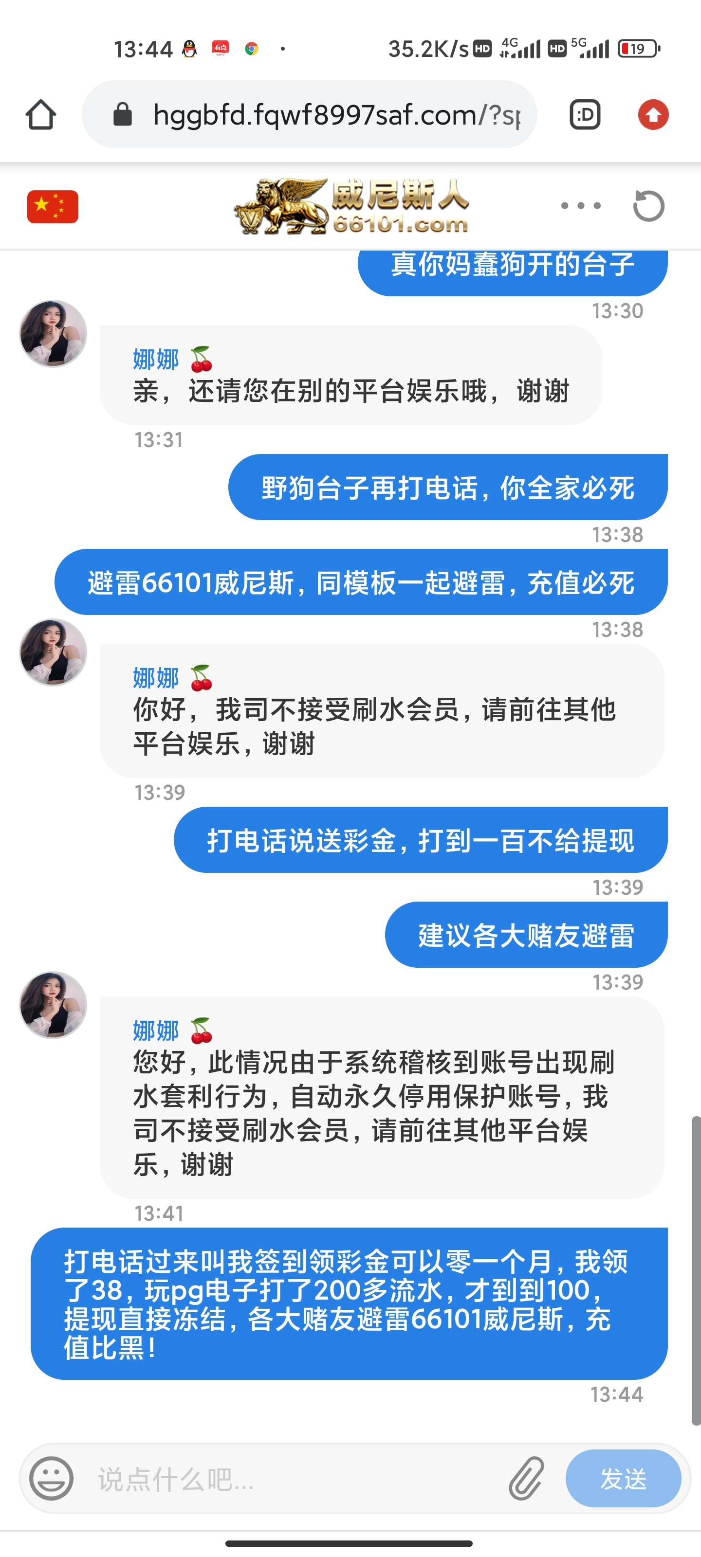 避雷66101威尼斯,同模板一起避雷,打电话跟我说签到领彩金,不需要流水就可以提现,我玩pg电子打了200流水好不容易打到一百,提现直接冻结账号,希望各位老哥遇到了不要充值,充值死