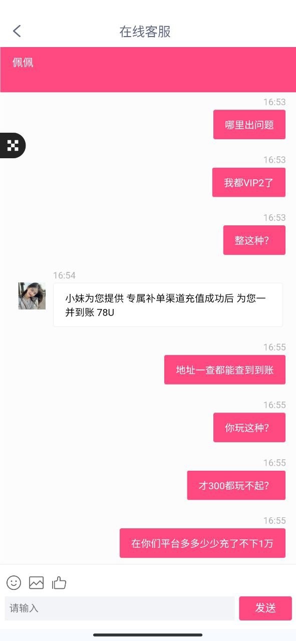 这平台我都VIP2累充不下1万了,用U充值300不到账,找客服给的理由是“掉单”! 用U充值还有掉单的吗,查链都看到地址收到钱了,还让我再冲一笔,两笔一起到账!!!
