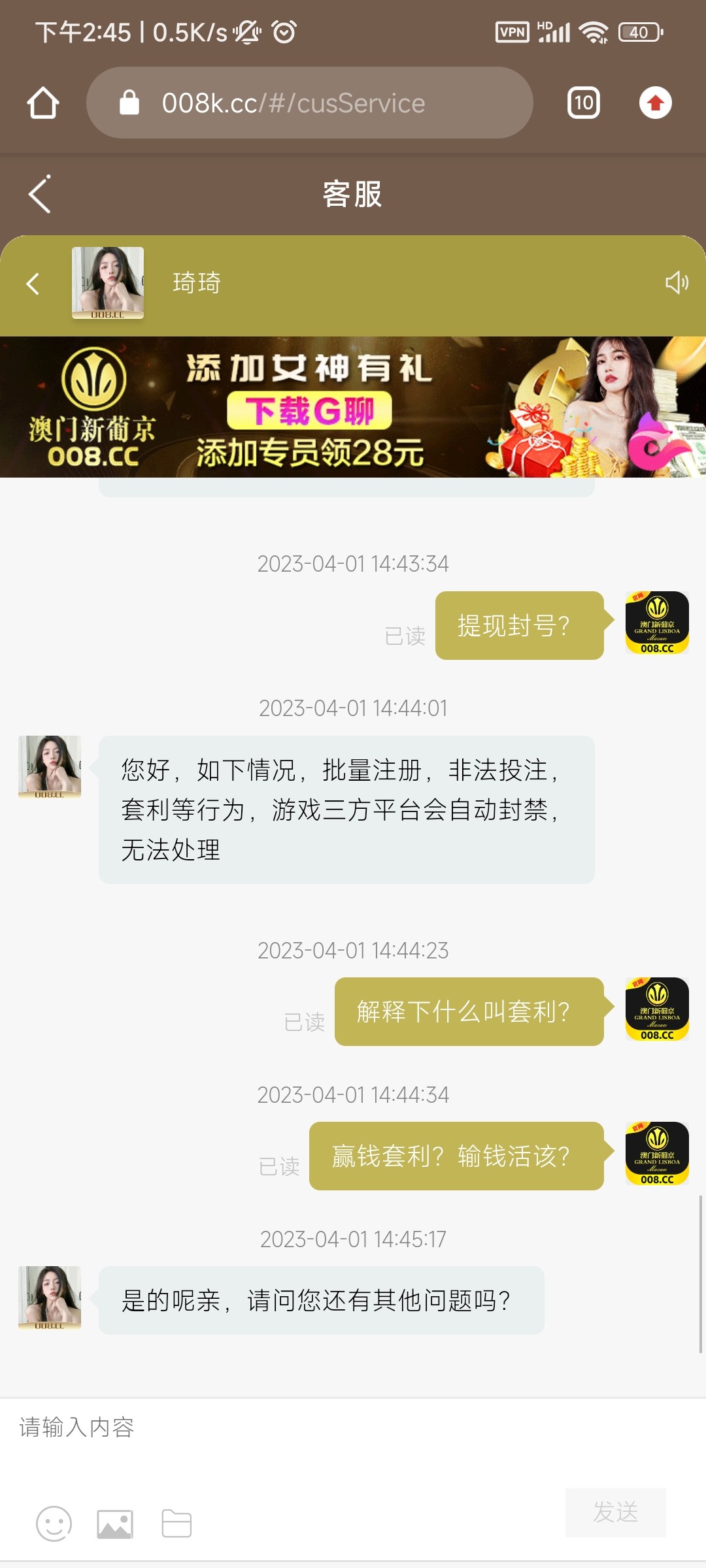 过几天回馈50。打到300套利封号。各位还在玩的注意下,没黑你是狗庄还看你有利可图,暂时不动你。
