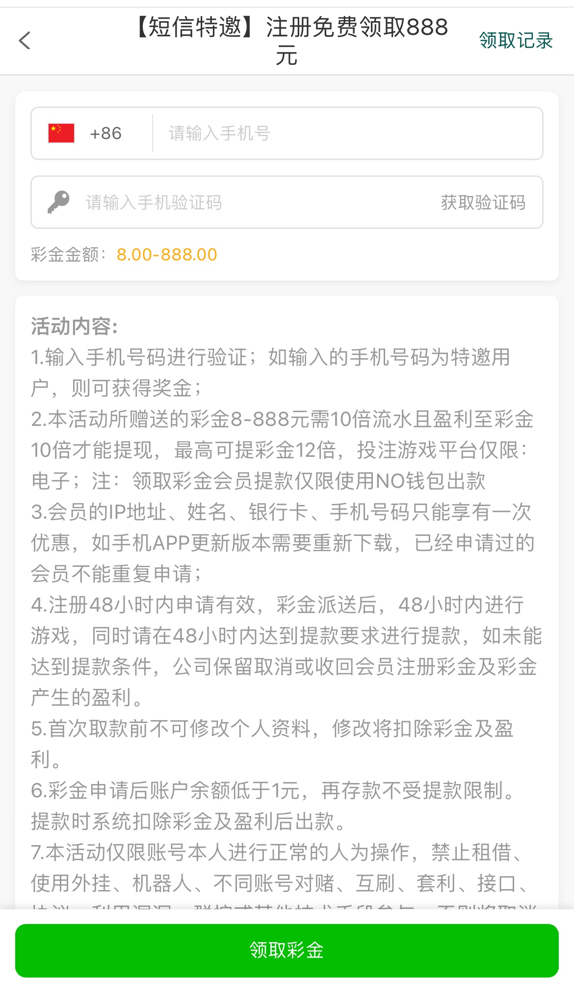 特邀碰瓷,注册绑定手机号/银行卡/个人信息,优惠自助领取,10倍流水且盈利至彩金10倍才能提现,最高可提彩金12倍,只能用NO全部取款