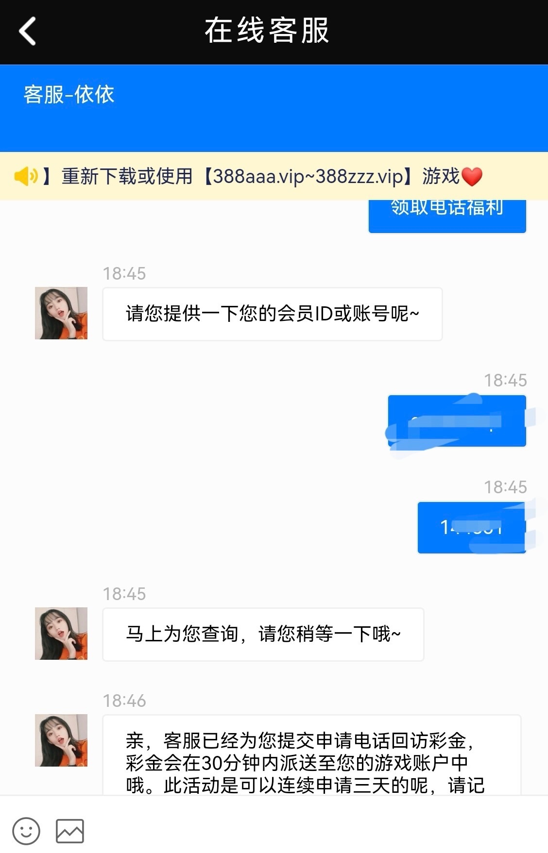 碰瓷电话彩金,送的24分3天送每天送8,联系在线客服申请