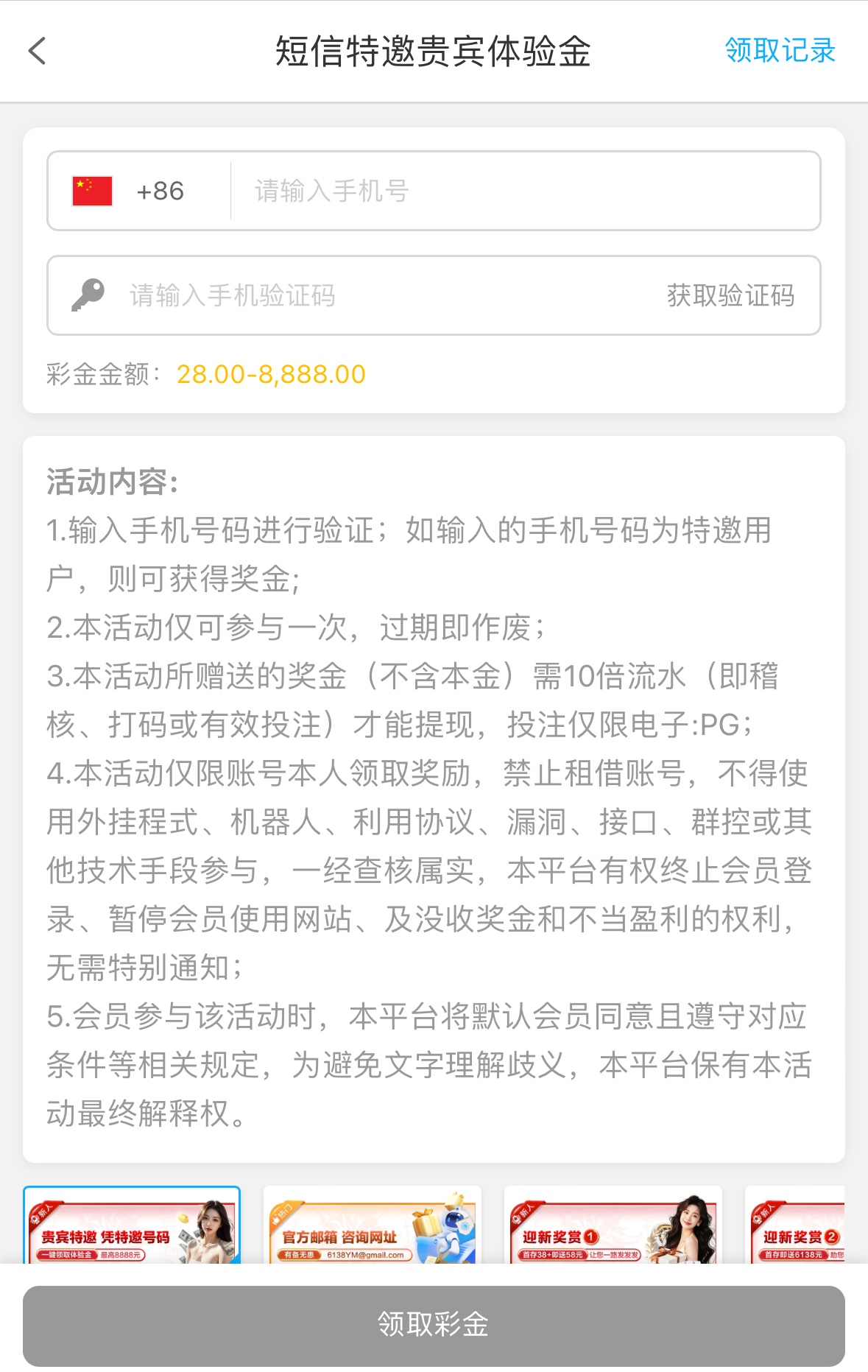 注册在优惠里自助申请,彩金10倍流水,限PG电子