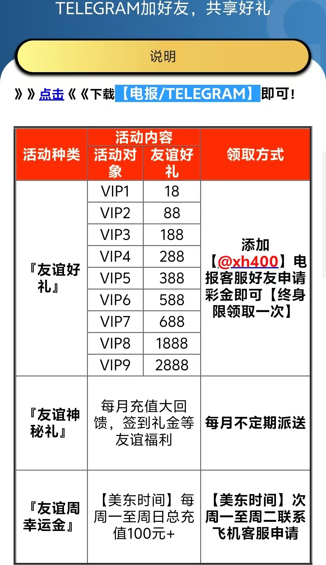有VIP等级的兄弟可以去申请领取彩金,彩金是根据VIP等级送的 飞机客服:@xh400