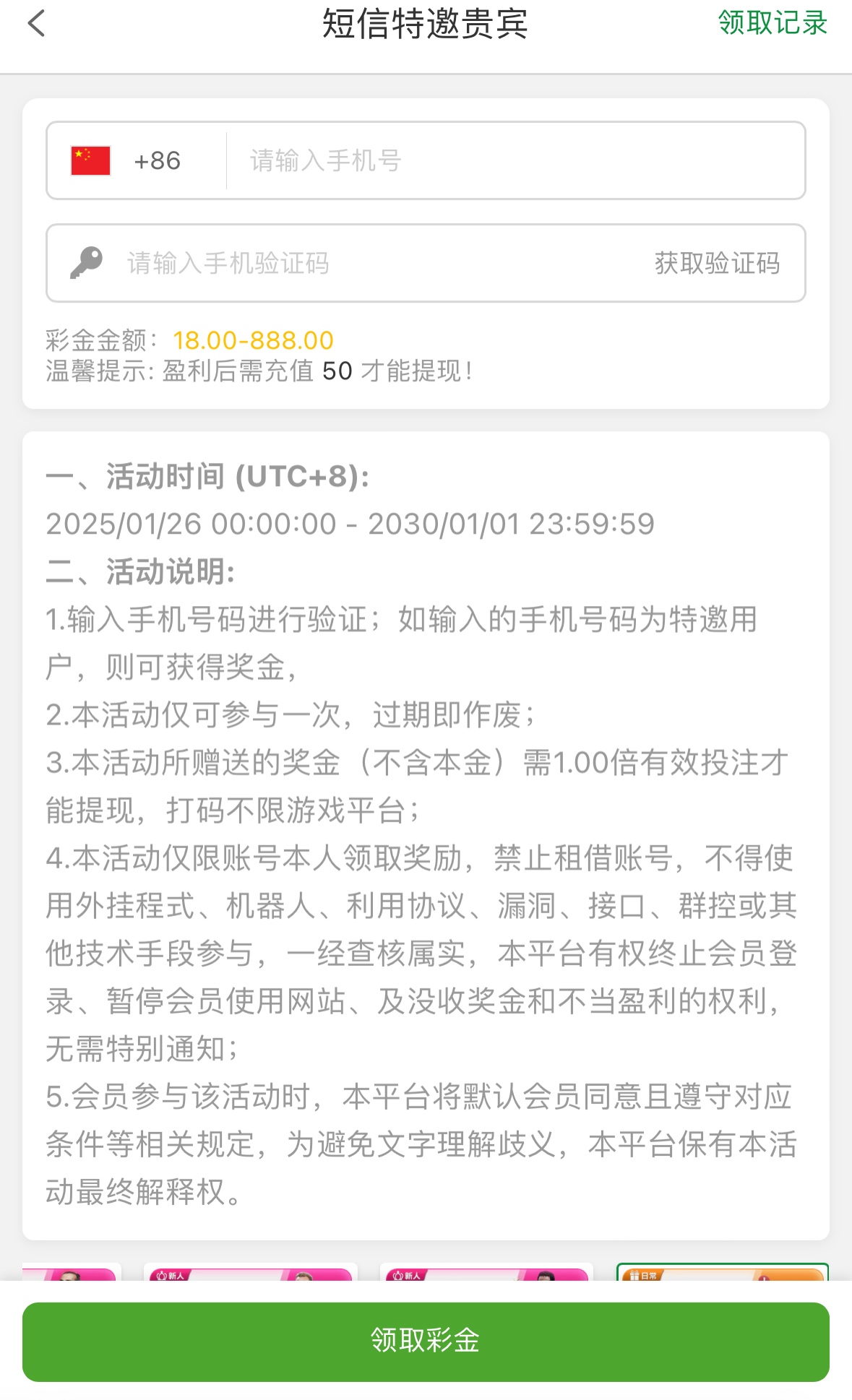 短信特邀碰瓷,注册在优惠里自助领取,1倍流水,要充值50才能提现,风险自理!