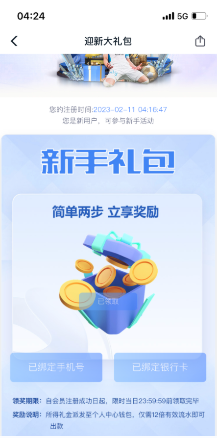 优惠-迎新大礼包一绑定手机号—绑定银行卡可领取68*12=816流水