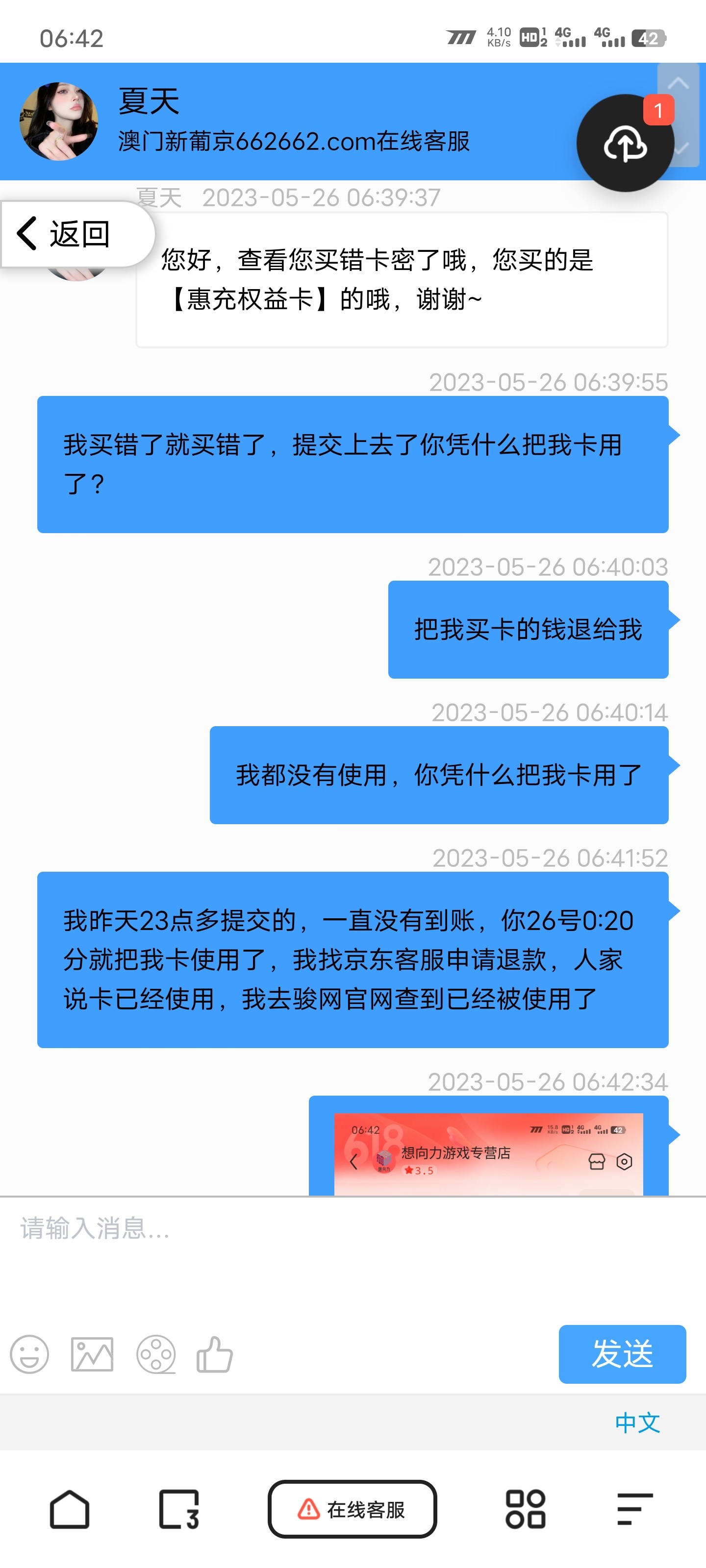 新葡京662买卡买错卡了,提交上去,不给到账,还把卡使用了,不给退,一直回避说我买错卡,垃圾平台