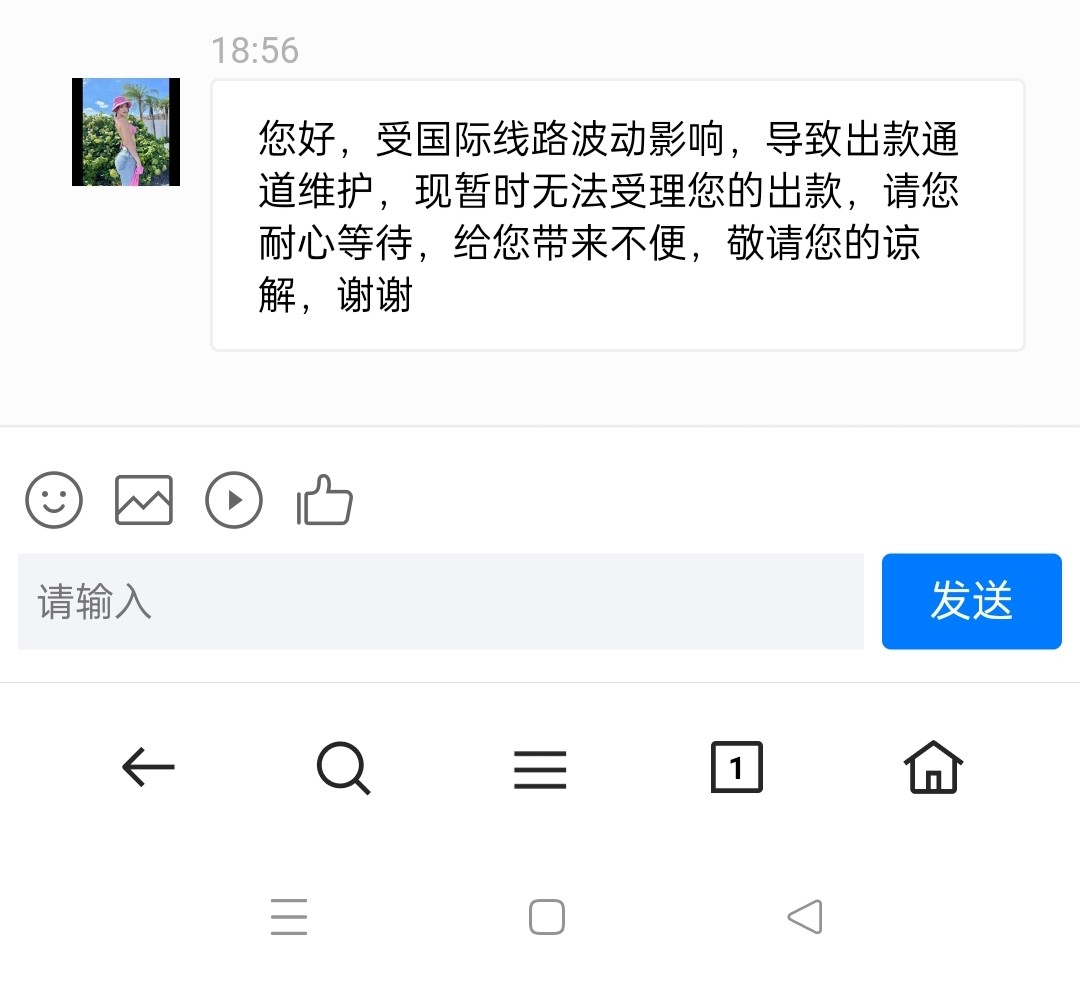 您好,受国际线路波动影响,导致出款通道维护,现暂时无法受理您的出款,请您耐心等待,给您带来不便,敬请您的谅解,谢谢